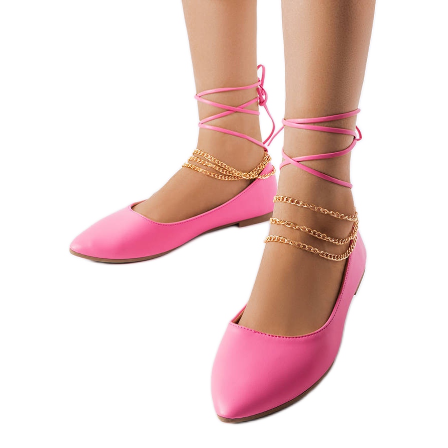 Donat pink ballerinas are stylish and practical shoes perfect for summer days. Slipped structure and a flat, pointed line give them a stylish look, and at the same time guarantee comfort throughout the day. A decorative chain in golden color adds fashion character, thanks to which ballerinas are great for both everyday and elegant stylizations.