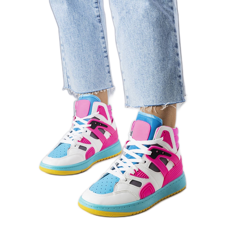 - color: white with fuchsia and blue accents (White/Blue/Pink), yellow sole