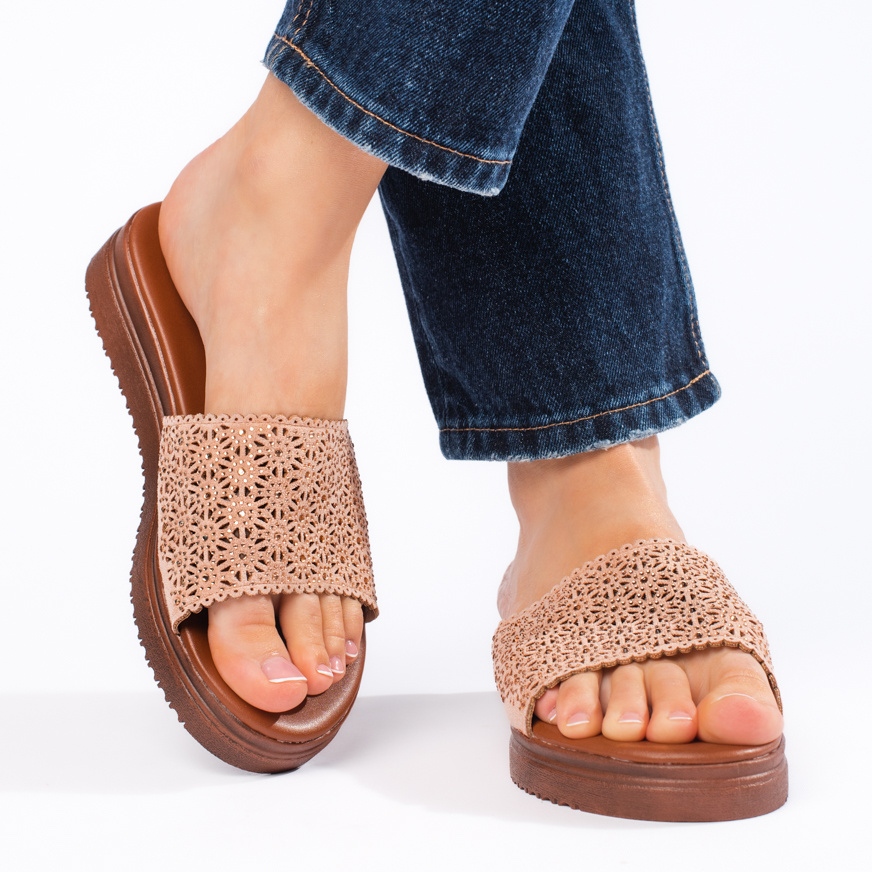 With a 4 cm platform, these flip-flops not only look stylish, but also provide the right grip and comfort. The smooth brown synthetic sole contrasts with the delicate pink of the upper, creating a harmonious whole. Additionally, the insole made of eco-leather guarantees maximum comfort during use.