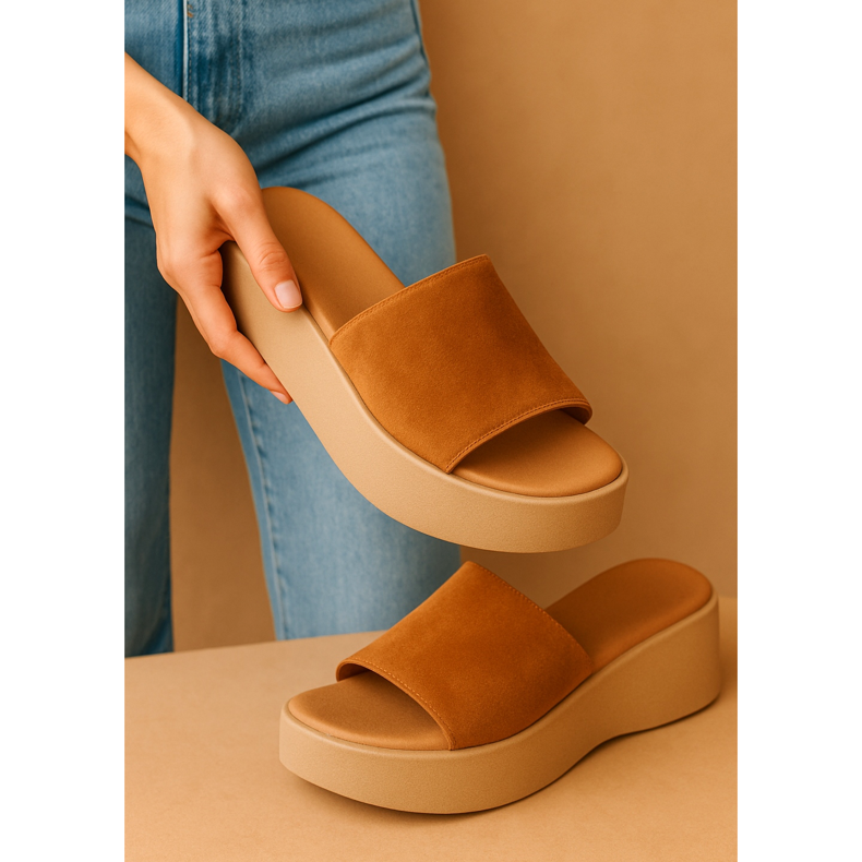 Suede platforms require more delicate care. Brush them regularly with a rubber suede brush, which will remove dust and lift the pile of the material. Before first use and regularly throughout the season, impregnate them with a preparation that protects against moisture and stains. Avoid wearing suede flip-flops on rainy days. If stains appear, use a special suede eraser or have the shoes professionally cleaned.