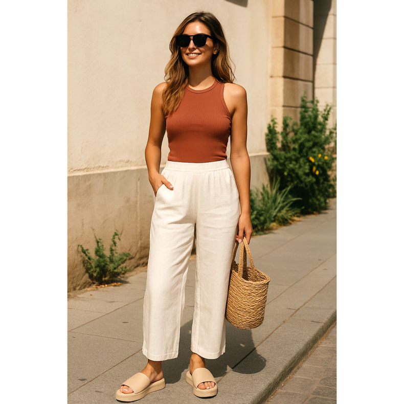 Loose-cut linen trousers look phenomenal with platform flaps. Choose white or cream pants and pair them with a fitted top in a contrasting color, such as terracotta or bottle green. Add a wicker bag and large sunglasses. This style is perfect for lunch in a restaurant garden or for a summer city fair.