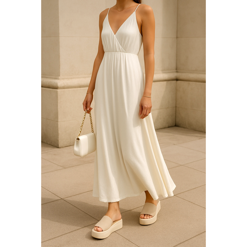 For a long maxi dress made of delicate, airy materials, choose flip-flops on a medium platform in a subdued shade. White or beige platforms will go perfectly with a bright, monochromatic dress. Add small gold jewelry and a small chain bag. This style will be perfect for a summer wedding in the garden, a garden party or an elegant outdoor party.