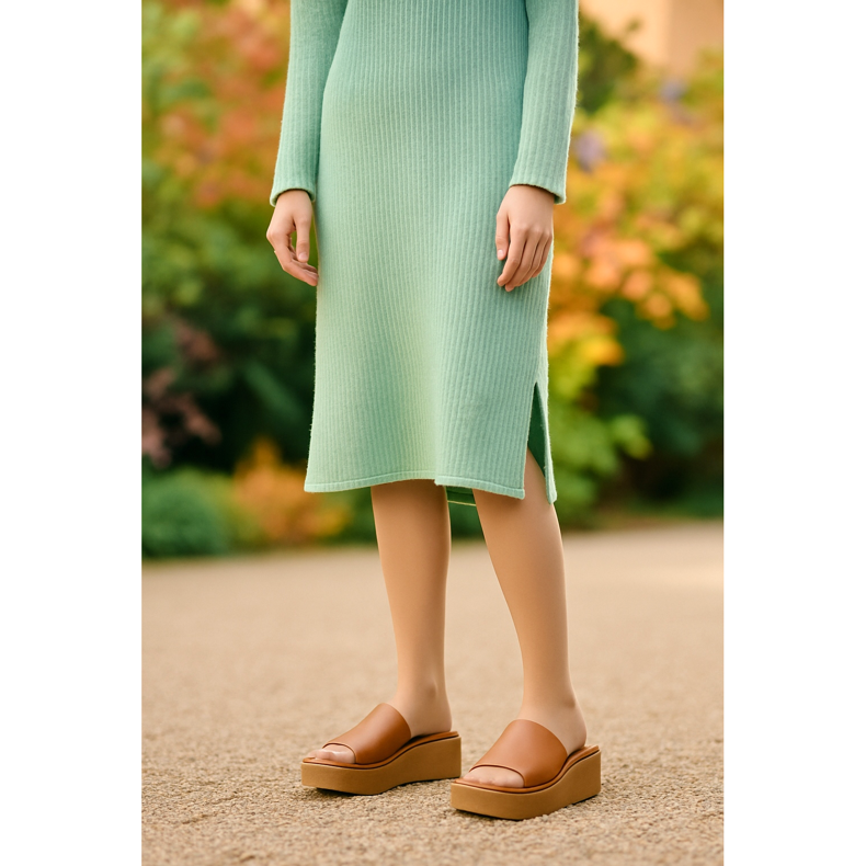To make the most of this effect, choose flip-flops in a color similar to the shade of your legs. Nude, beige or caramel platforms combined with exposed legs will create the illusion of very long limbs. In summer, you can wear them without tights, allowing your skin to tan and blend naturally with the color of your shoes. This is especially beneficial for women of shorter stature who want to optically gain a few centimeters.