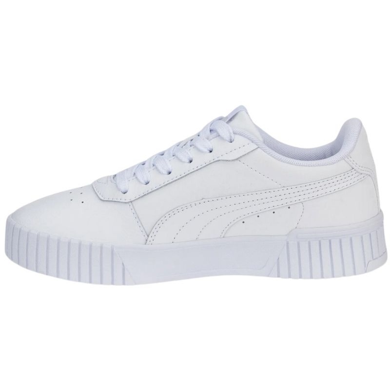 The Carina 2.0 Jr model, in white (catalog number 386185 02), is characterized by high quality of workmanship typical of the renowned Puma brand. The upper of the shoe, designed with children's needs in mind, is made of ecological leather, which corresponds to contemporary ecological trends and conscious fashion. Perforations on the front and side of the shoe are also extremely important, providing better ventilation of the foot, which is crucial when using it on warmer days.