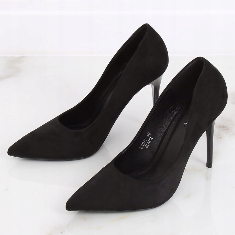 Suede pumps on a stiletto heel black LE07P Black are a perfect choice for every woman who wants to combine elegance with a timeless style. These suede pumps are distinguished by a slim 10.5 cm heel, which optically lengthens the legs, giving them a stunning look. The classic black color makes them a perfect complement to both everyday and evening stylings.