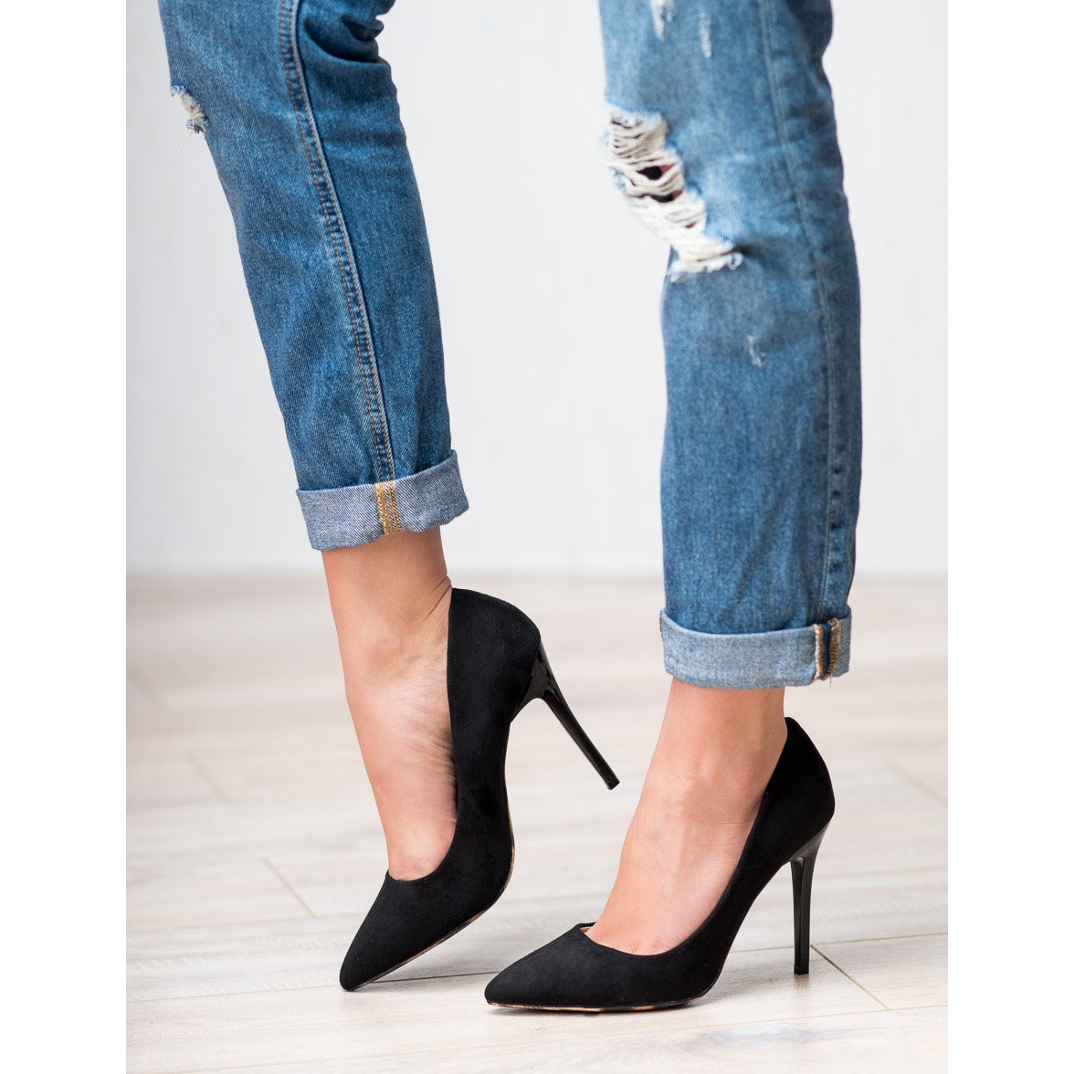 Erynn pumps on a stiletto heel are the quintessence of elegance and femininity. Made of high-quality ecological leather imitating suede, these classic black shoes are the perfect choice for special occasions. Their tapered toe and profiled sole perfectly adapt to the shape of the foot, while ensuring comfort of wearing.