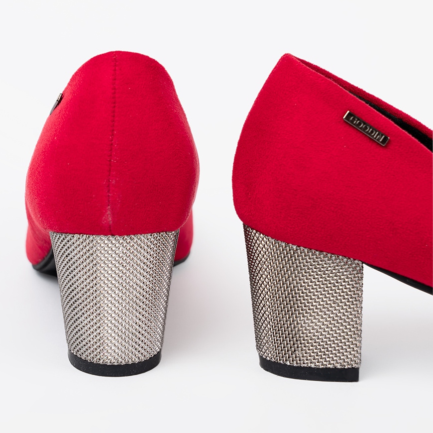 Discover the unique style and elegance thanks to women's pumps! These red pumps on the silver post is a must-have in every female wardrobe. Made of high quality imitation suede, they guarantee comfort and attractive appearance.