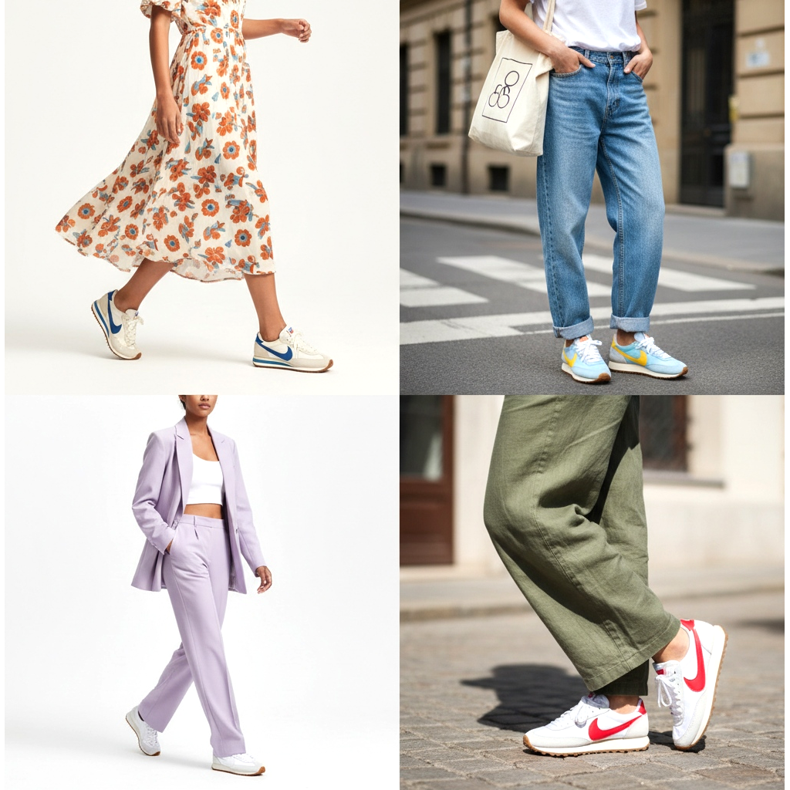 For a midi dress: A light midi dress made of fabric with flowers or geometric patterns combined with cream retro running shoes is one of the most popular looks of the season. This contrast between the femininity of the dress and the sporty character of the shoe creates an exceptionally dynamic and fresh styling.