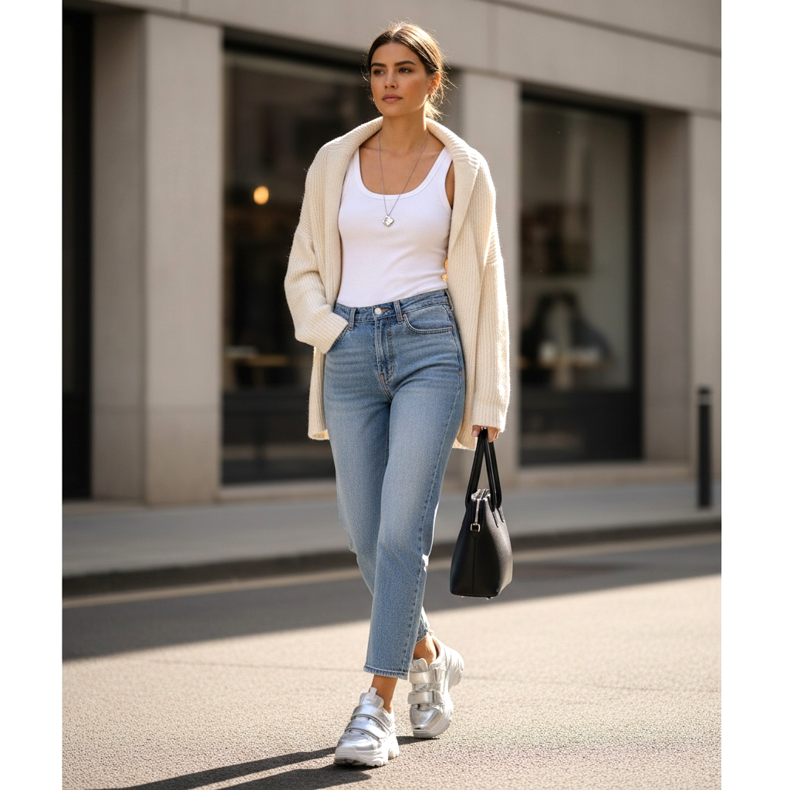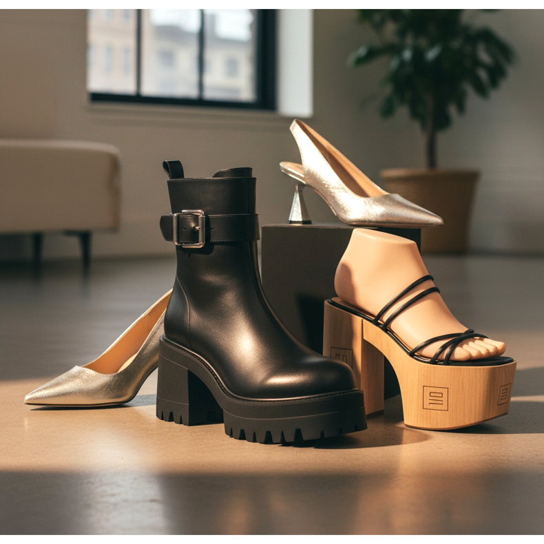 Metallic shoes — silver and gold — are the third category. Silver ankle boots, golden mules, metallic slingbacks - these are shoes that in 2026 are no longer reserved exclusively for parties and weddings. They are worn with everyday styling with denim or underwear with a new meaning.