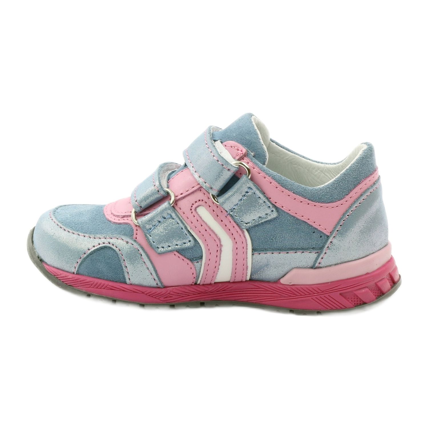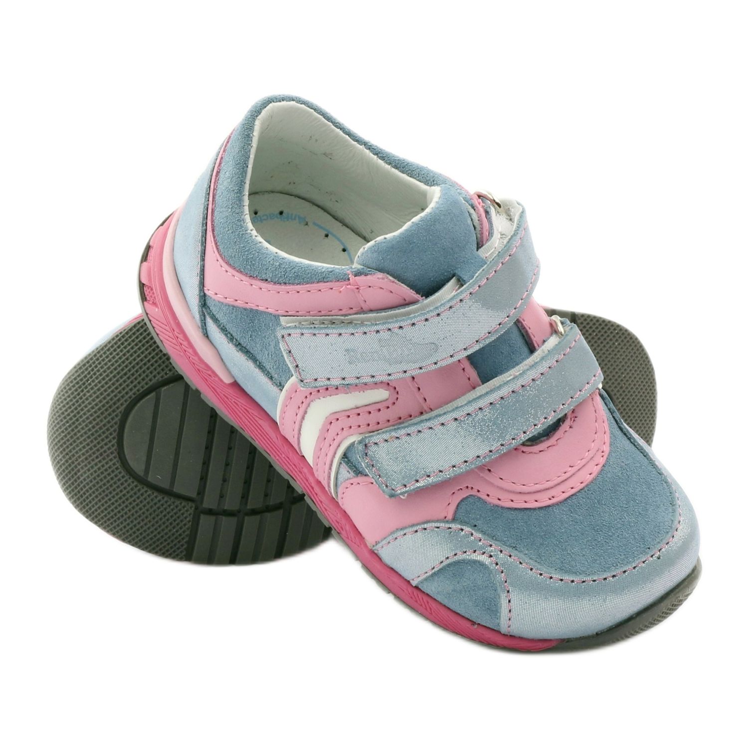Stylish and comfortable shoes for girls that combine delicate, pastel colors with functional solutions. The upper is made of soft, natural leather in shades of blue, light pink and white with shiny accents. Two wide, blue Velcro straps make it easier to put on and precisely adjust the shoe to the foot, and the stiff heel provides adequate stabilization while walking.