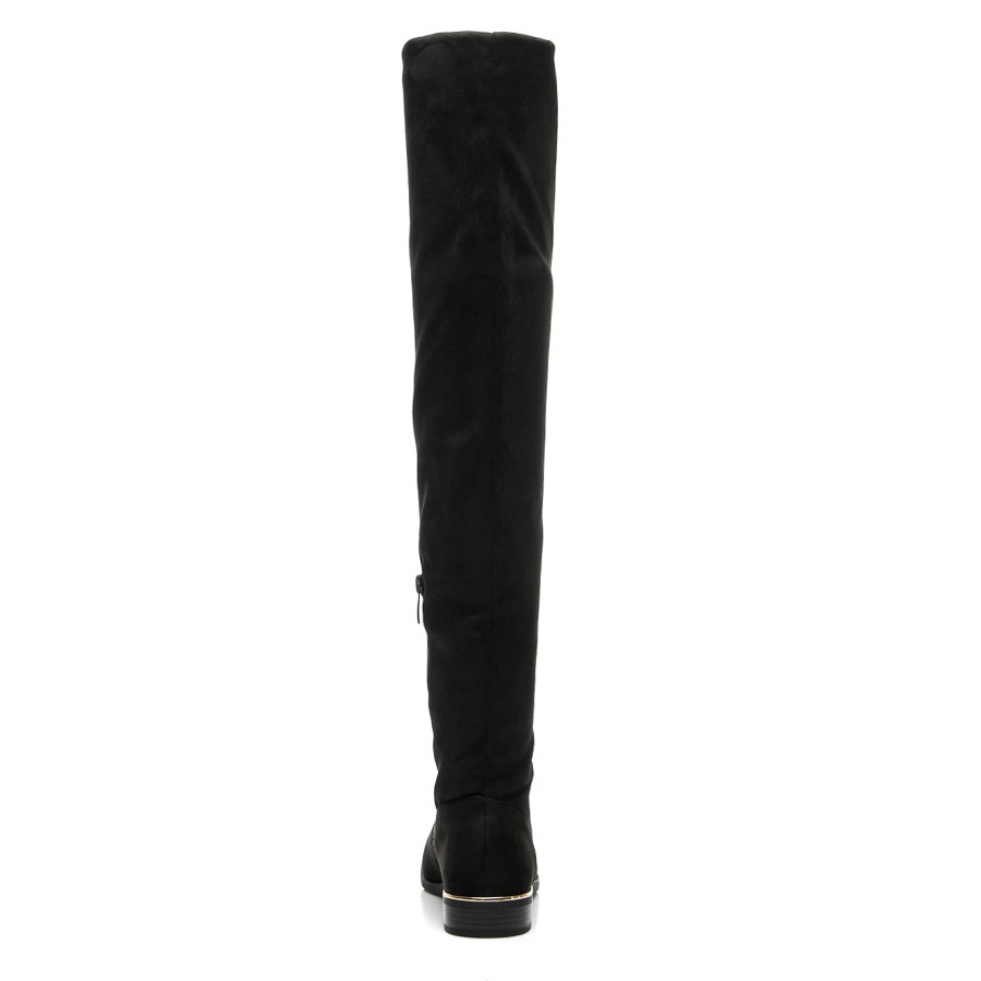Invest in elegance and comfort with the Super Me women's boots in a classic black color. These unique shoes, made of high-quality ecological leather with a suede finish, are a great solution for colder days. The uppers reaching below the knee add chic and emphasize the legs, and their classic design fits into many fashion styles.