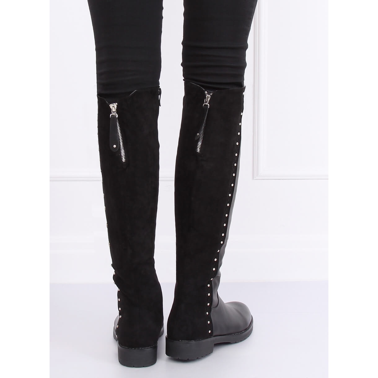 Their classic black color makes them a perfect match for a variety of styles – from casual to more elegant. The high upper reaching down to the knee, decorated with spectacular studs and rhinestones, gives the shoes a distinctive character and makes them stand out from the crowd.