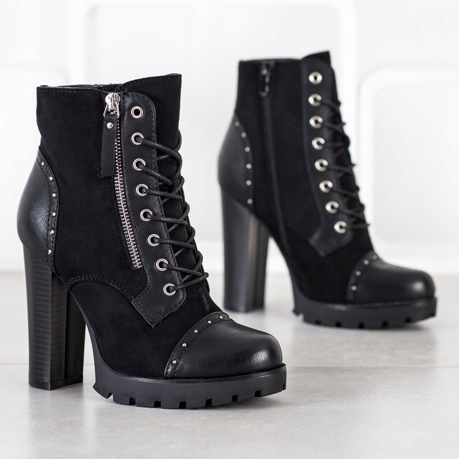 The ankle-high boots have a lace-up closure and a practical zipper, which makes them easy to put on and take off. The 11 cm high block heel adds elegance, while making the legs look slimmer. The synthetic sole with tread guarantees good grip, which is important, especially in the autumn-winter season.