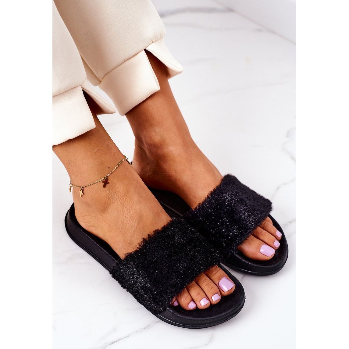 Add style and comfort to your everyday wardrobe with the unique PE1 flip-flops in black. These beautiful women's flip-flops combine modern design with functionality, providing everyday comfort. Made of lightweight, foam material, they are the perfect solution for summer days, and their ecological fur property emphasizes care for the environment.