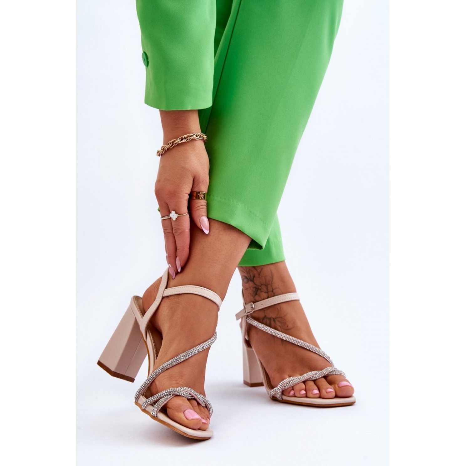 Made of high quality organic leather, sandals offer not only aesthetic appearance, but also durability. Their unique style is emphasized by intertwining stripes decorated with rhinestones imitating rhinestones that give them shine. The central strap on the front gives the footwear an elegant character, making them a great choice for summer days.