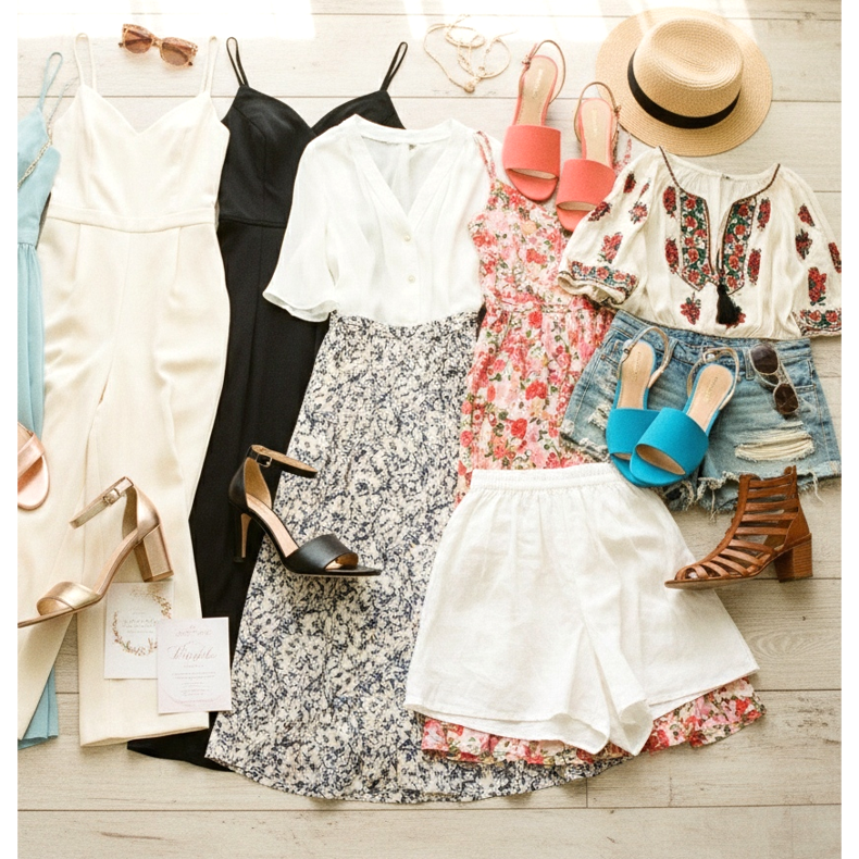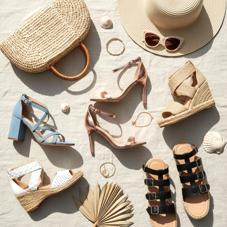 Flat sandals with an ankle strap are a more casual option, perfect for denim shorts, knee-length dresses or linen skirts. For the beach and holidays: sandals in coral, blue or white with an ankle strap and a flat sole are a comfortable and stylish choice. For a music festival: multi-strap sandals, a bit gladiator-style, with denim shorts and a boho blouse.