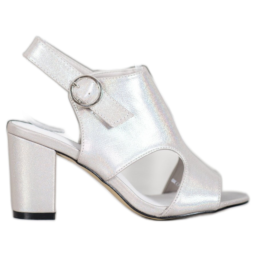 The sandals are equipped with an open-toe upper and a heel counter, which ensures comfort and allows you to freely show off your feet. Made of eco-leather, their surface delights with a subtle, light gray color that attracts the eye with a holo effect, adding a modern expression to the whole.