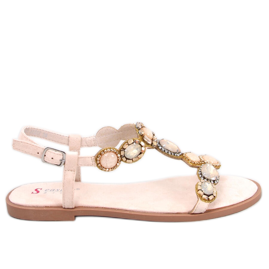 The sandals are characterized by an original application of shiny stones and zircons, which will add shine to any outfit and make you feel special. Made of ecological suede, they provide comfort with every step, and their durable synthetic sole makes them an ideal choice for summer days.