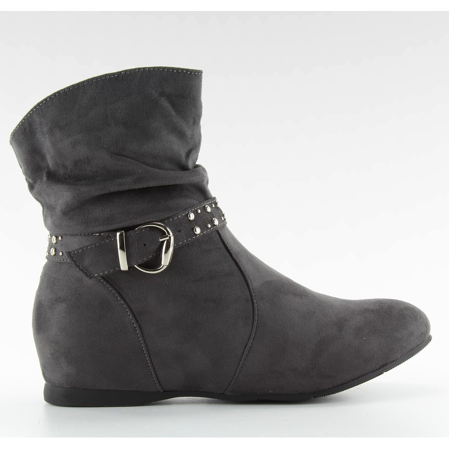 Saszki belt with studs PE103 gray - stylish and comfortable women's ankle boots that are perfect for everyday use. The gray color and suede eco-leather create a universal, elegant look, and the ruffled upper with a decorative stripe with studs adds character. A hidden 5 cm wedge provides subtle lift without sacrificing comfort.