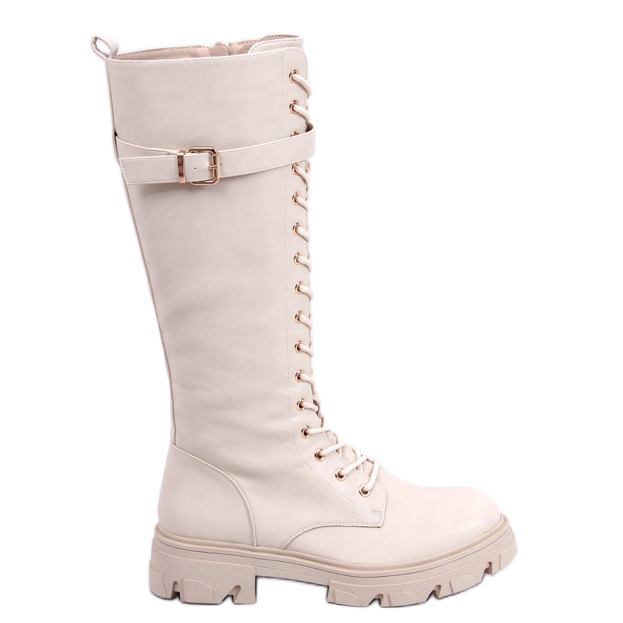 These knee-high boots go great with a variety of styles, from casual to military. The beige color makes them incredibly versatile and easy to match with other wardrobe items.