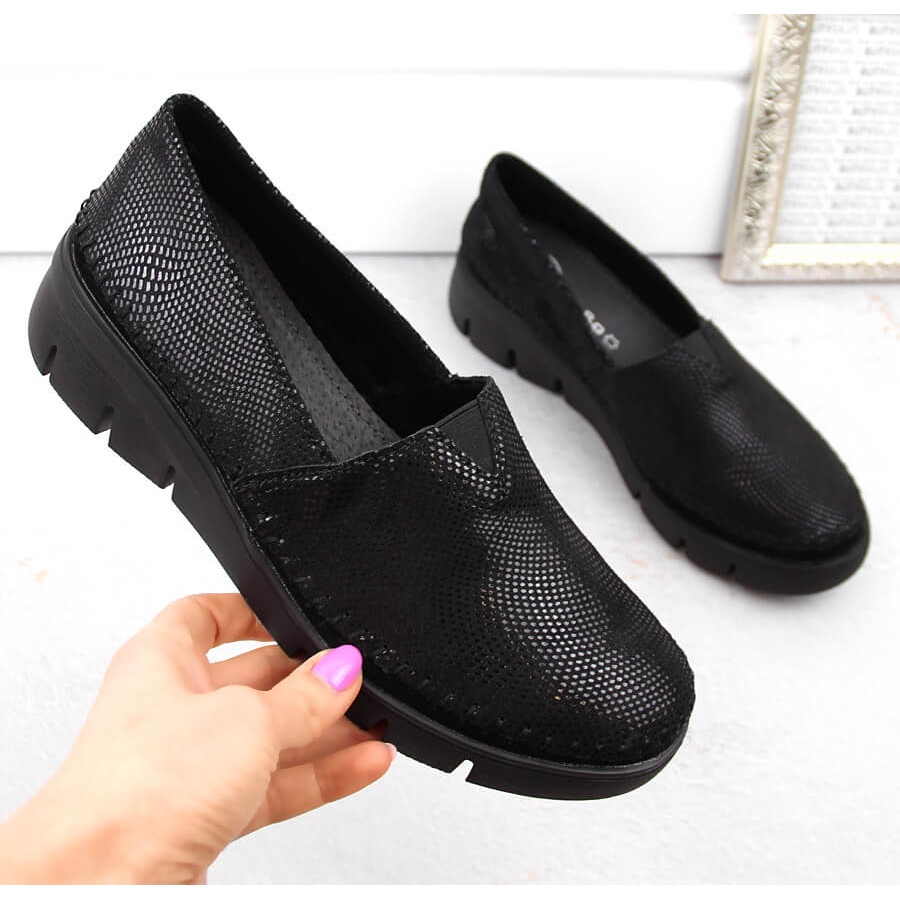 The 5 cm high platform ensures comfort while lifting the silhouette, and the slip-on fastening makes it easy to put on and take off quickly. The shoes are available in an elegant black color, which adds a touch of luxury to any wardrobe. Perfect for work, meetings or evenings out, these shoes combine fashion with practicality.