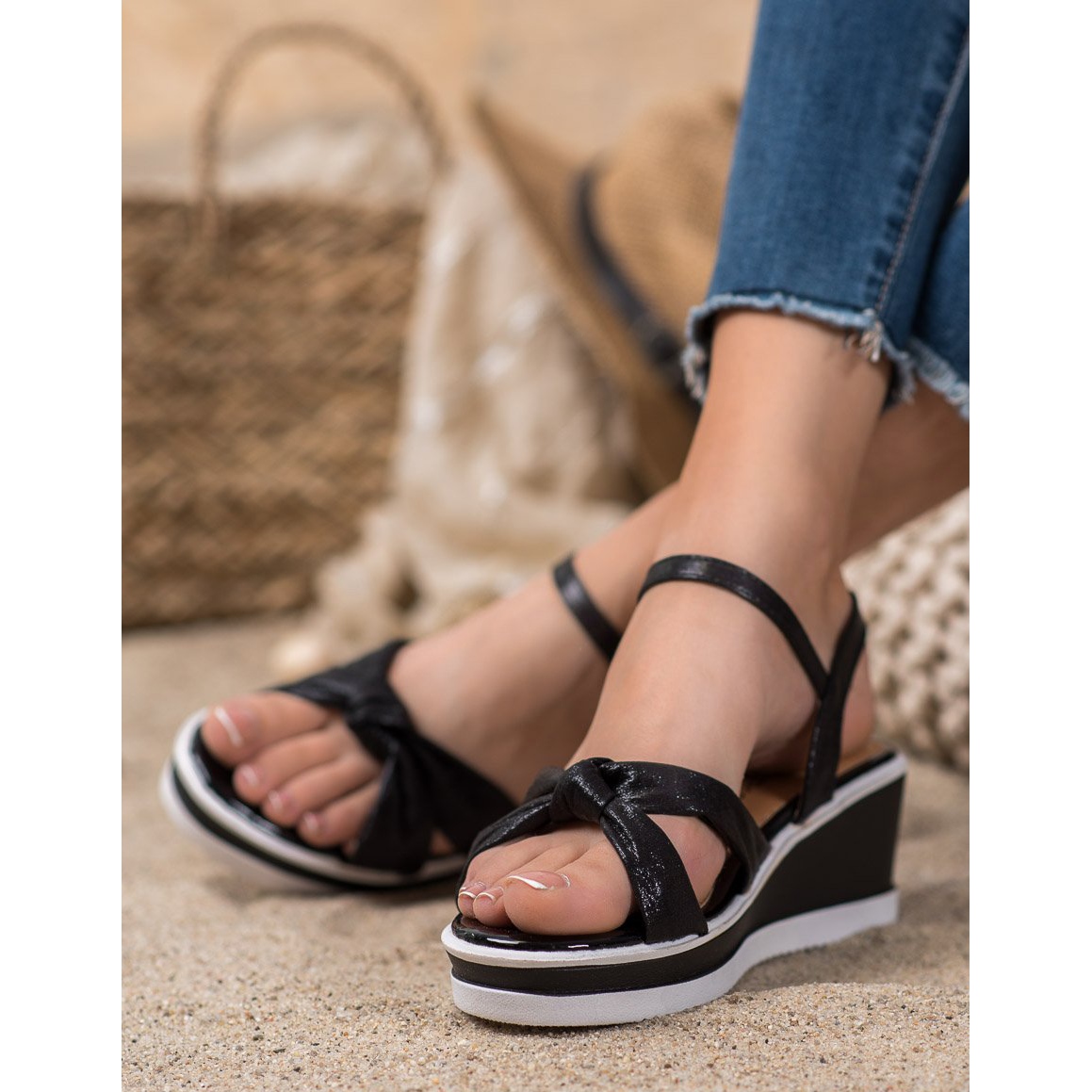 The sandals are made of high-quality ecological leather, which ensures comfort and durability. The open heel and buckle allow for easy putting on and adjusting to the foot. The 6 cm high wedge and 2.5 cm platform guarantee comfort while adding a few centimeters to your height.