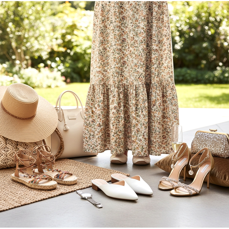 In 2026, gladiator sandals for maxi dresses are fashionable - their characteristic straps stand out from under the edge of the dress and create an eye-catching detail. Heeled or platform flip-flops are a more comfortable option for longer outings. Remember that with a maxi dress you don't have to worry about a flat sole - as long as the dress doesn't drag on the ground, flat sandals are an excellent and comfortable choice.