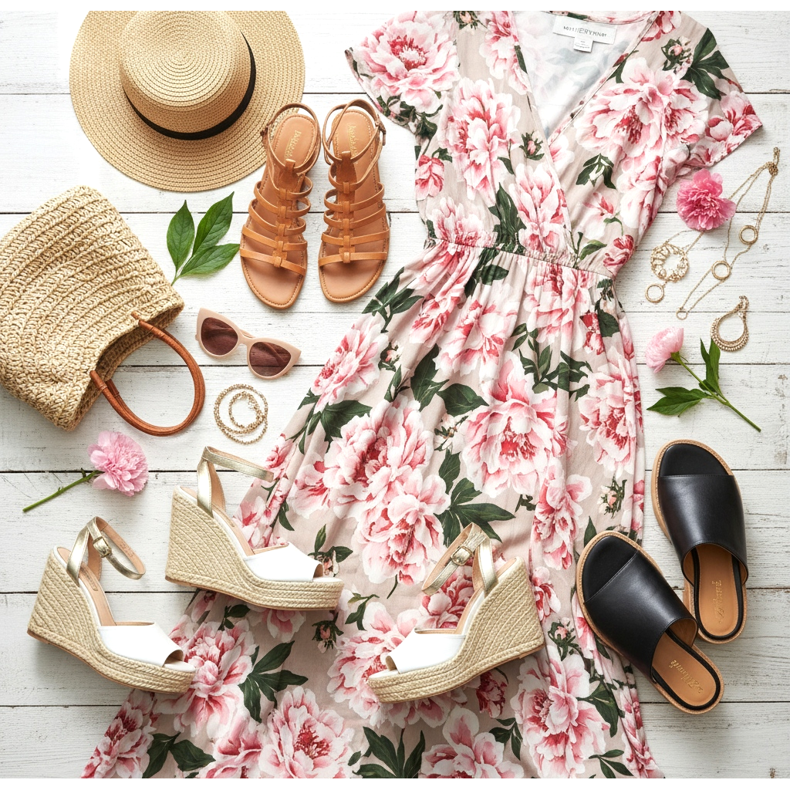 The simplest and most natural combination is a maxi dress and sandals. An airy, floral boho-style dress and flat leather sandals are a classic summer look that never gets old. High-heeled or wedge sandals are perfect for a more elegant maxi dress made of silk or chiffon, as they add elegance and optically lengthen the silhouette.