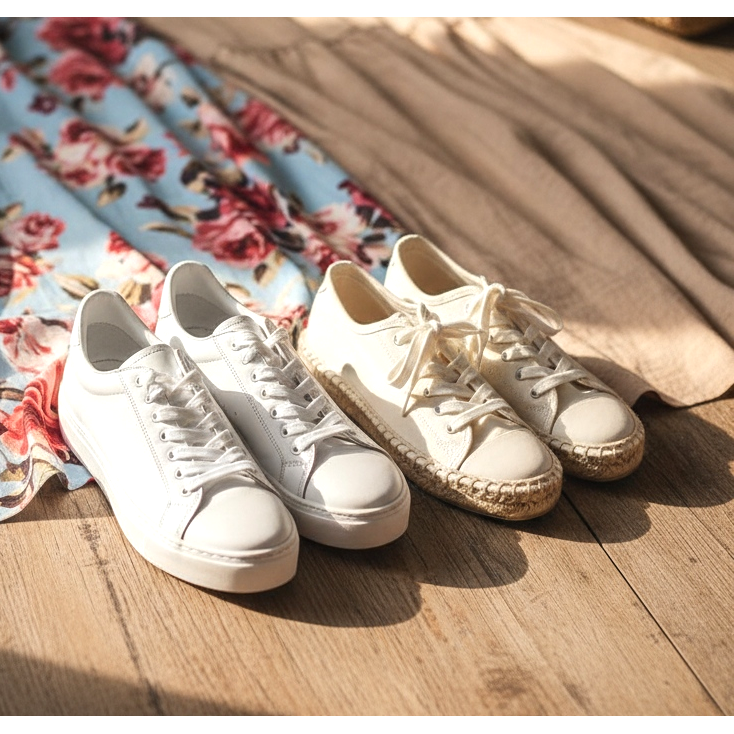 For a more minimalist maxi dress made of linen or cotton, ultra-slim sneakers or classic canvas sneakers create a casual, summer look. For a festival, a market or a walk around the city - this combination is both comfortable and stylish. Choose sneakers in neutral colors (white, cream, beige) that will not clash with the pattern of the dress.