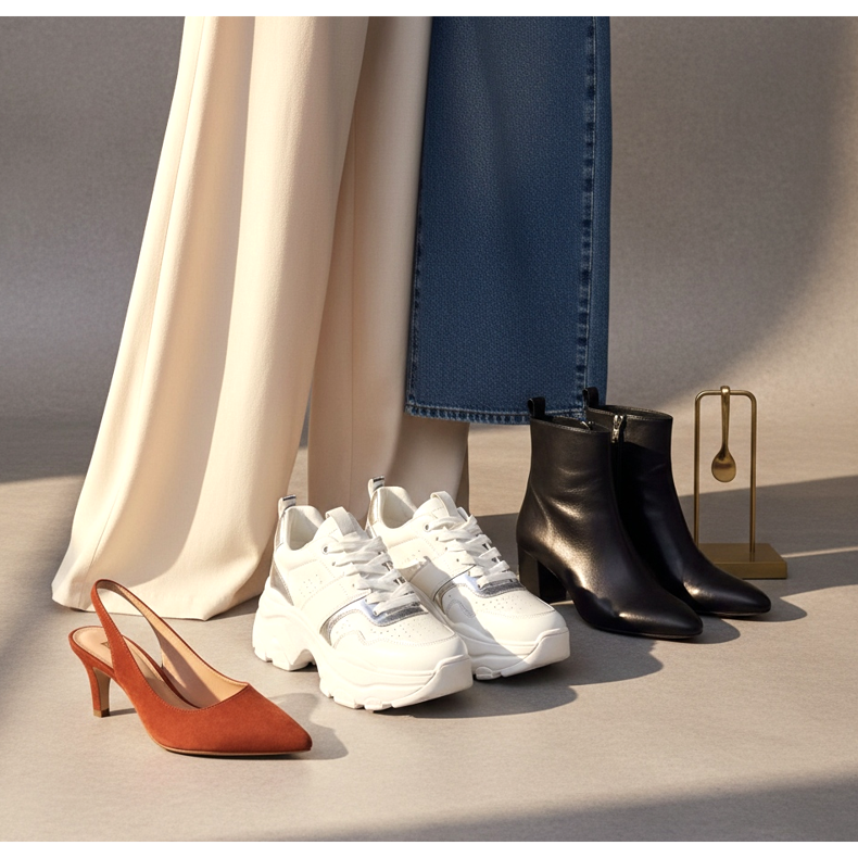 Matching shoes to wide palazzo pants is a skill that is based on a few simple rules. First, add height - a heel, platform or thick sole is your ally. Secondly, match the length of the trouser leg to the height of the shoe - this is crucial for the proportions. Third, choose slim, pointed styles that balance the volume of wide legs.