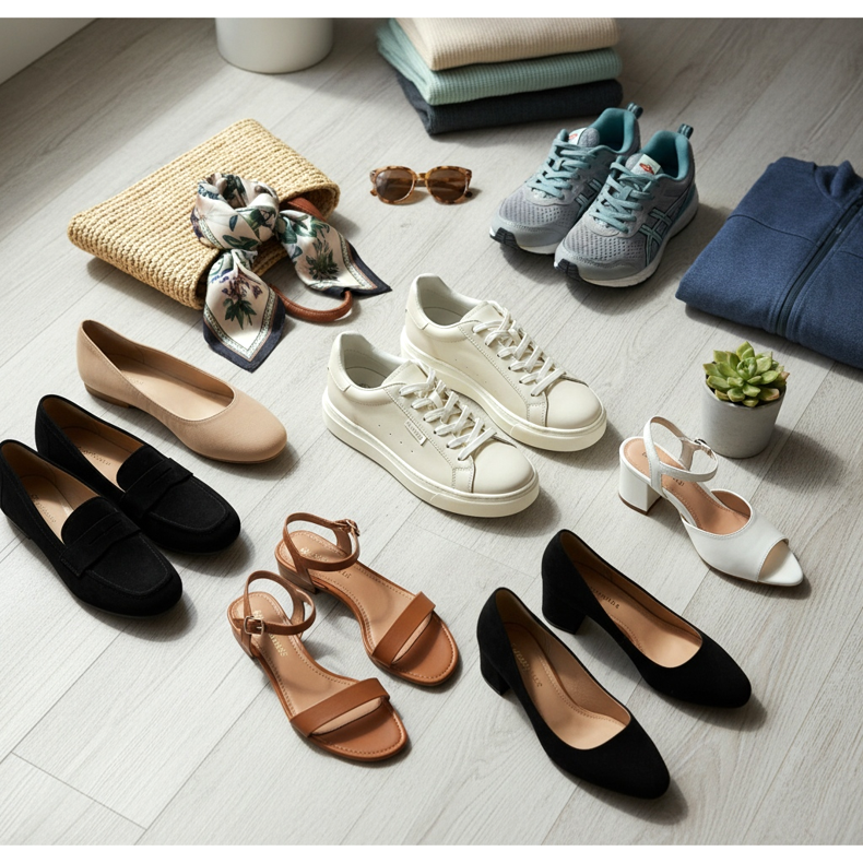 Thirdly – comfortable sandals for warmer days. Choose a model with a flat sole in a natural skin tone. Fourth - high heels for evening outings. Classic high-heeled pumps or elegant mules will work perfectly.