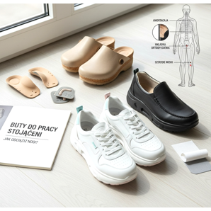 Many employees praise preventive and medical footwear, e.g. clogs or Birkenstock flip-flops. Their contoured insole supports the arch of the foot and enforces correct posture. However, remember that such shoes should have a strap that holds the heel - slapping the shoe with each step tires the muscles unnecessarily.