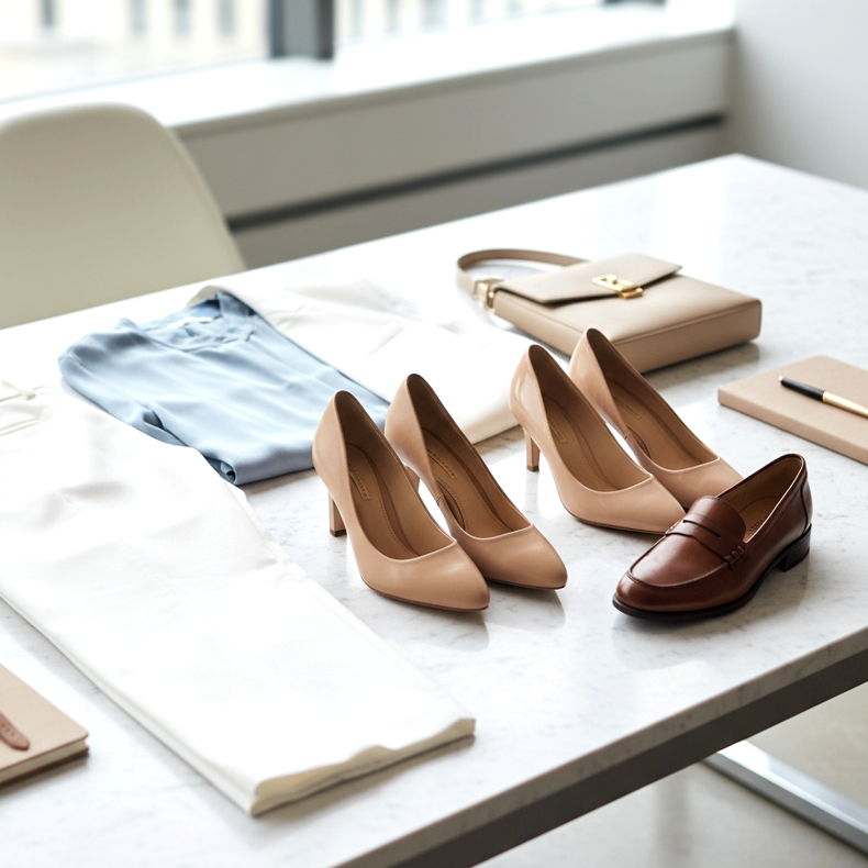 Classic beige pumps with white cigarette pants and a fitted jacket are a recipe for a perfect office styling. A low or medium stiletto will add elegance without excessive formalism.