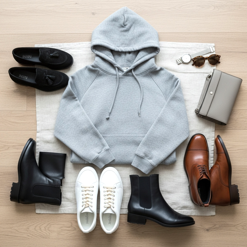 If you combine an oversize sweatshirt with jeans or trousers, you can choose elegant shoes or loafers. These sweatshirt shoes will work well both in the office and every day, providing comfort and an elegant look.