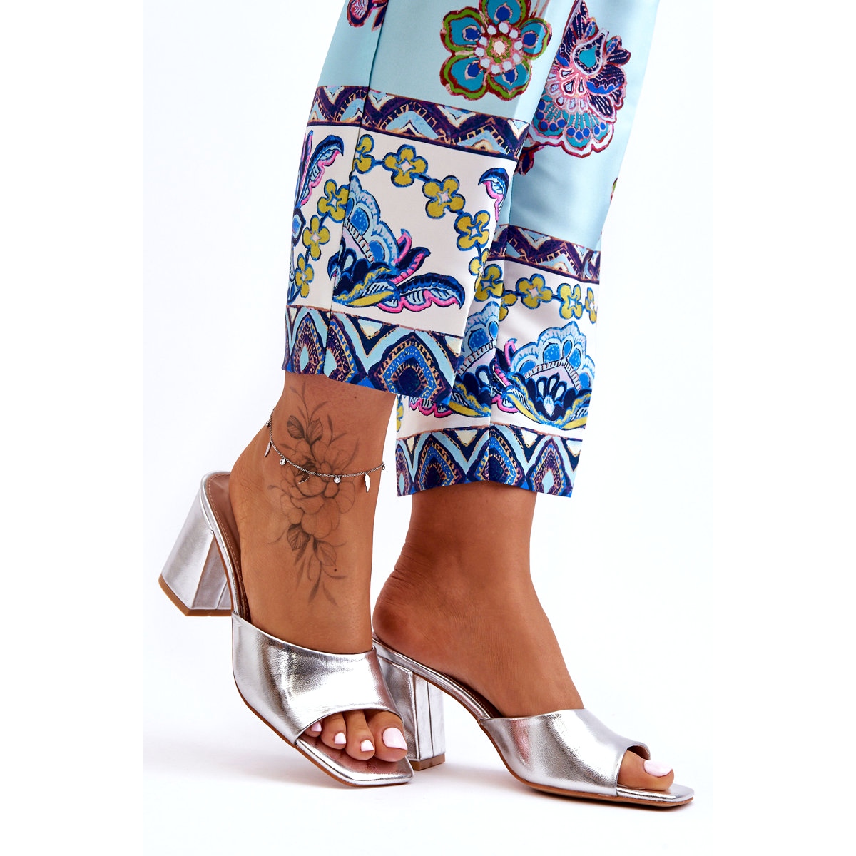 Discover the comfort and style with women's eco-leather-like metallic flaps in silver. These elegant flip flops, made of eco leather, stand out with an open, square nose that gives them a modern character. The eco leather insert ensures wearing comfort, and a stable heel in the form of a 8 cm high post adds not only style, but also emphasizes the figure.