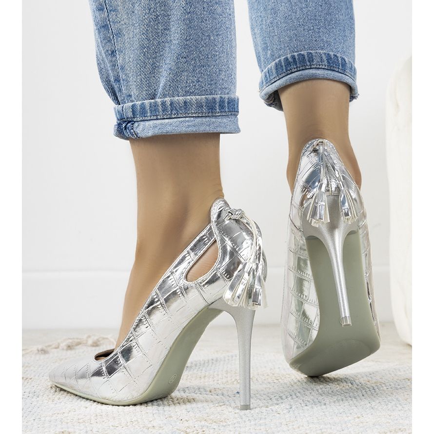 Silver Permewan pumps with decorative cutouts are a great choice for women who want to emphasize their elegance and style on evening outings. These unique pumps, made of ecological leather in a fashionable crocodile-like structure, combine modern design with a touch of classic.