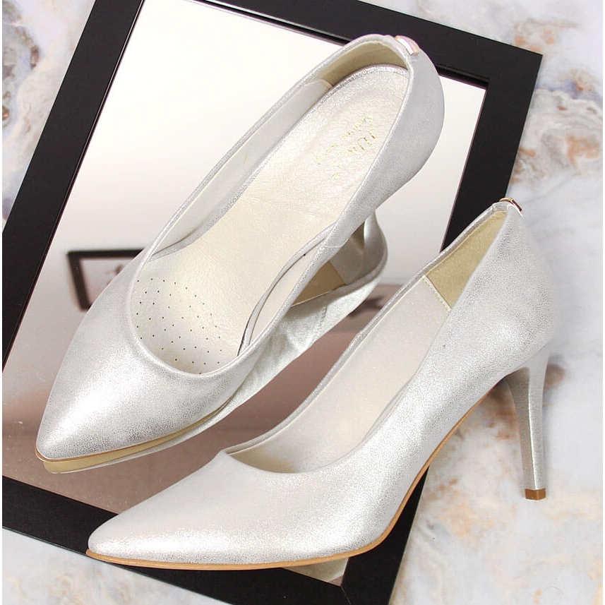 The silver color and elegant style make these shoes ideal for both everyday, casual outfits and more formal occasions. The high, slim 8.5 cm heel adds femininity and lengthens the silhouette, and the slip-on fastening makes it easy to put on. This model, without a pattern, is characterized by a minimalist design that will surely appeal to every fan of modern fashion.
