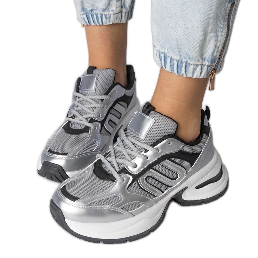 Silver sports sneakers on a massive sole is a proposal that will certainly attract the attention of every fashionable woman. The YY-9 L model in an elegant silver color combines modern style and comfort, perfectly fitting into current trends. The 6 cm high platform guarantees excellent cushioning, which makes the shoes perfect for both everyday stylizations and for sports activities.