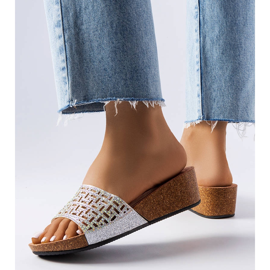 Elitha flip-flops are distinguished by a thick, rubber strap decorated with an application of shiny zircons, which beautifully reflects light and attracts attention. The sole is complemented by a wedge sole, which not only beautifully highlights the legs, but also guarantees comfort when worn. The brown plastic sole contrasts with the silver finish, giving the shoes an original character.