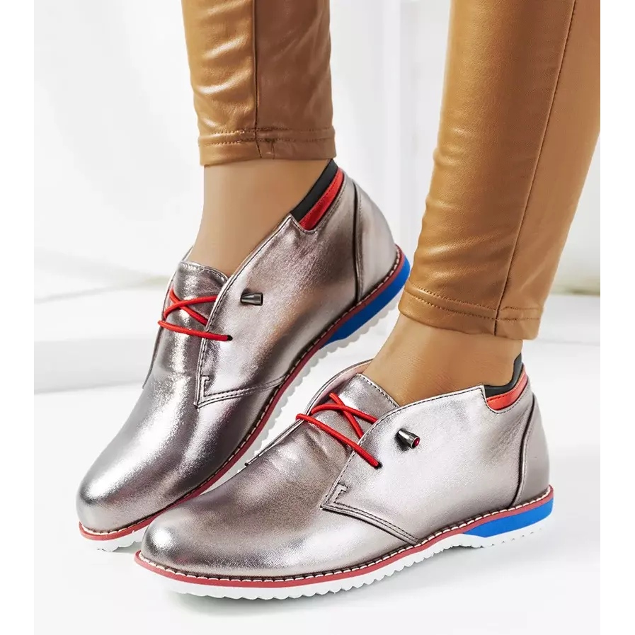 Silver Reyes women's half-boots are the perfect choice for women who want to add shine to their spring stylings. Made of high-quality eco-leather, these elegant shoes stand out with their metallic color that attracts the eye. Red and blue accents subtly contrast with the dominant silver, giving the footwear originality and expressiveness.