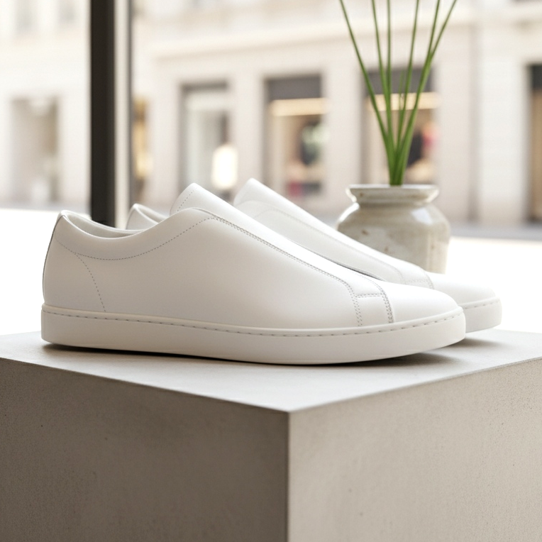 Slim-line sneakers revolutionize styling because they combine the comfort of sports shoes with the elegance of classic shoes. For office work, pair white slim sneakers with narrow creased trousers and a fitted sweater or shirt. This outfit is professional and at the same time expresses individual style.