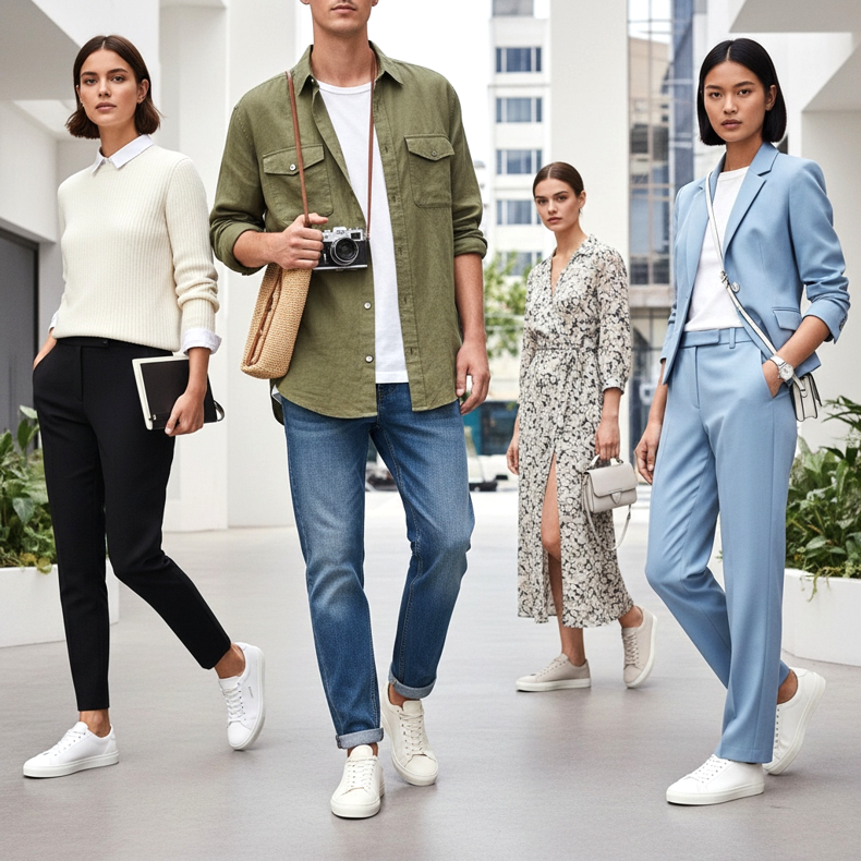 White or cream slim-line sneakers look particularly impressive with a spring suit - women's or men's. This is one of the key streetstyle trends of 2026: formality combined with sporty casualness. Choose this look if you want to look stylish and modern.