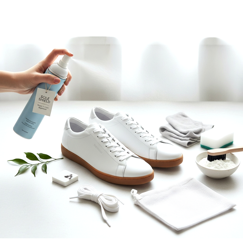 Bright slim-line sneakers are beautiful, but they require regular care. The basis is protection against dirt immediately after purchase: impregnating spray for fabrics and leather is a mandatory step before wearing for the first time. Apply it evenly and let it dry before leaving the house.
