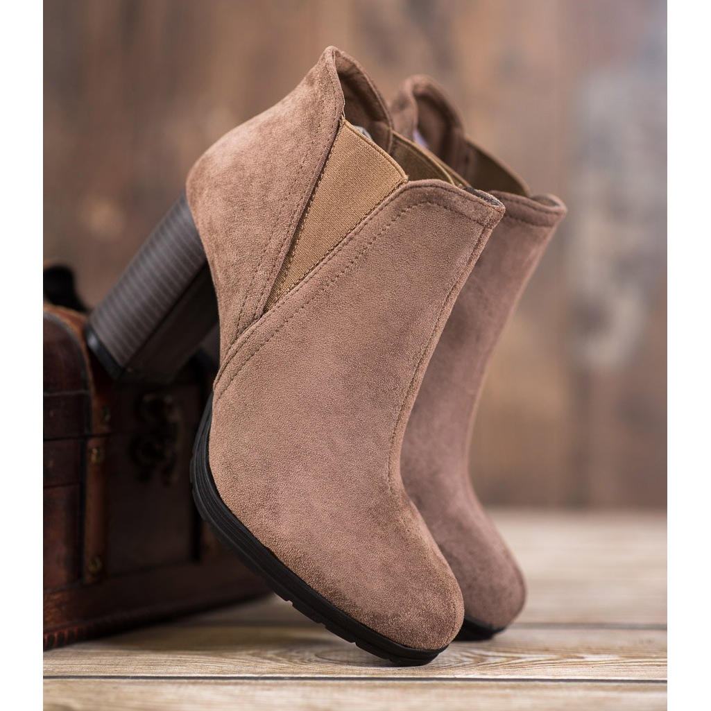 SHELOVET ankle boots in brown are a great choice for every woman who values style and comfort. Made of high-quality ecological suede, these classic slip-on ankle boots will be an ideal solution for people who choose animal-friendly products. A stable 8.5 cm high heel on a block heel ensures comfort even for a longer period of time, making them a great choice for everyday wear.