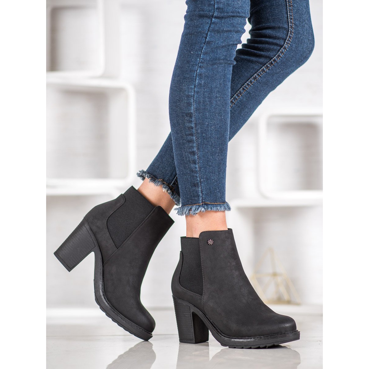 Add a touch of elegance to your wardrobe with slip-on heeled ankle boots from Goodin. These classic black ankle boots are made of high-quality ecological suede, making them not only stylish but also environmentally friendly. The ankle-high upper effectively protects against cold air and moisture, and their 8-centimeter heels on a solid block guarantee comfort and stability with every step.