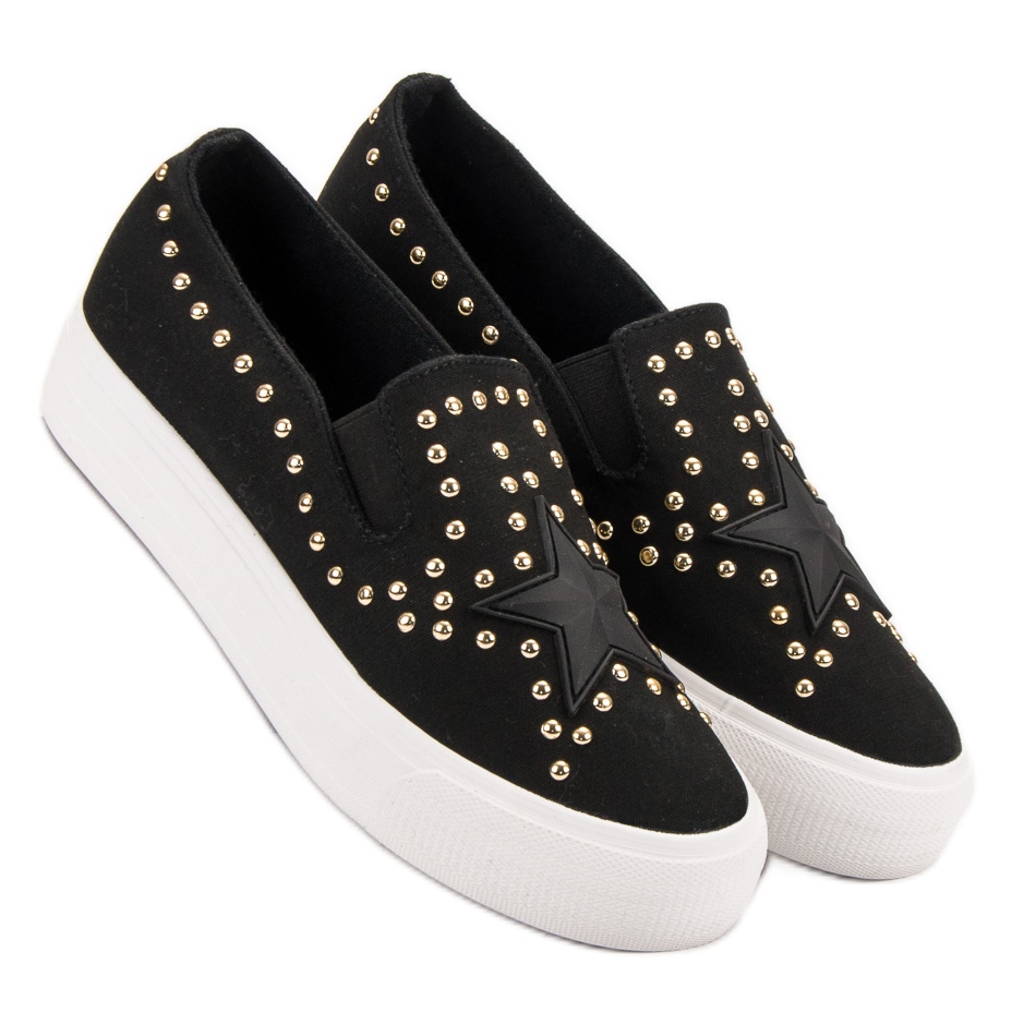 Their minimalist, black design decorated with spectacular star-shaped rhinestones gives them a rock character, thanks to which they will easily attract the attention of the surroundings. The sneakers are characterized by a low height and a soft heel, which ensures stability and comfort of wearing all day long.