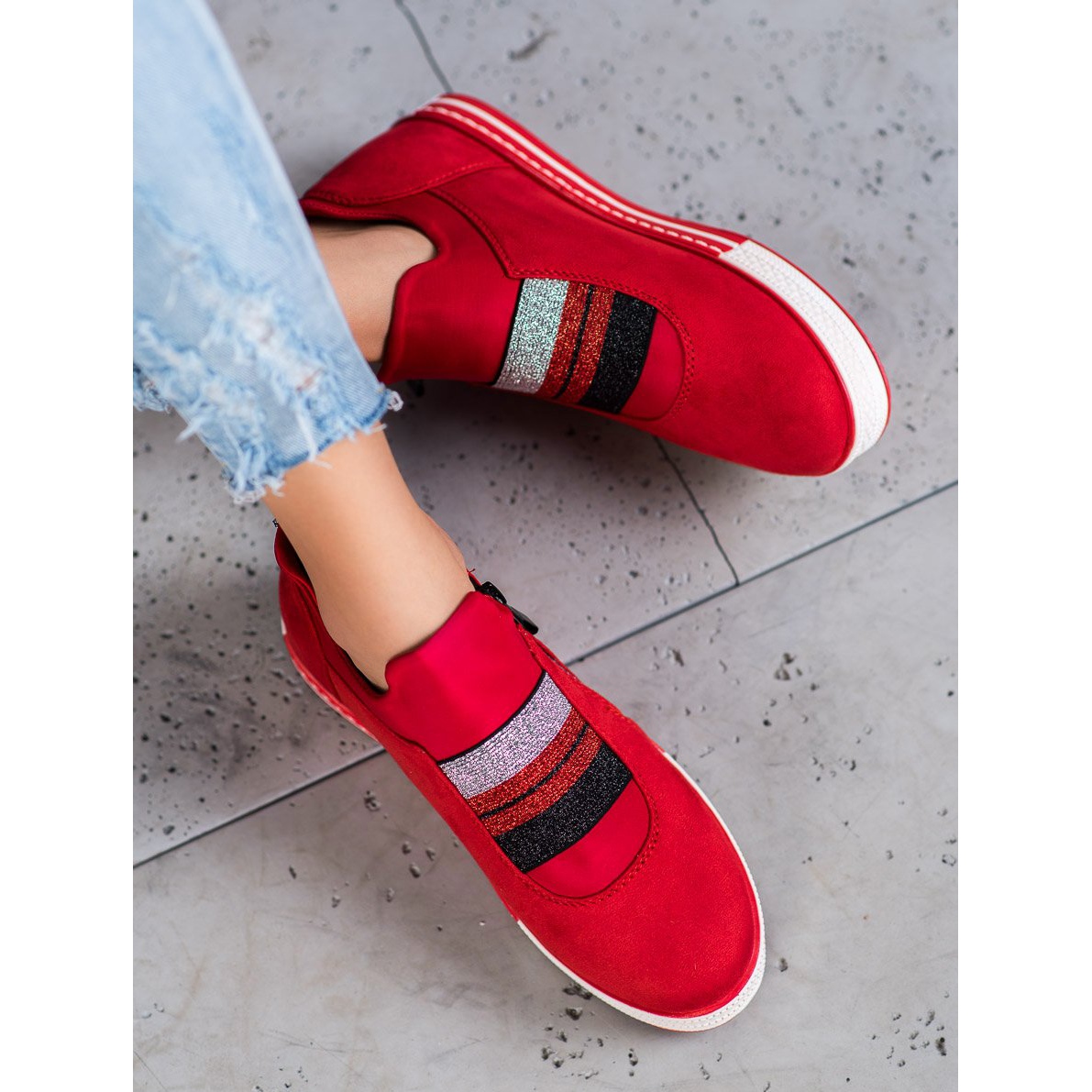 Change up your wardrobe with red sneakers from Ideal Shoes, which combine sporty style with fashion accents. These slip-on shoes with a practical zipper are a great solution for women who value comfort and appearance.