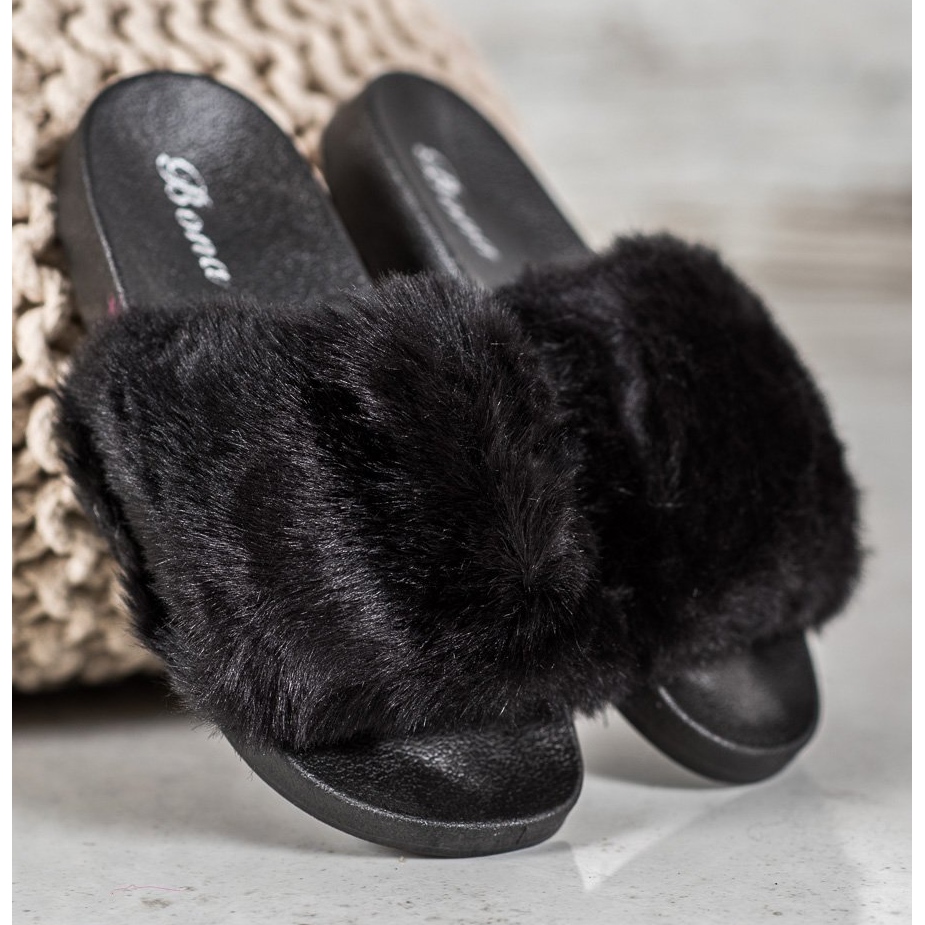 Black Bona fur flip-flops are unique footwear that combines style and comfort, ideal for warm days. Their minimalist, black color makes them a perfect match for a variety of styles, from everyday to more casual.