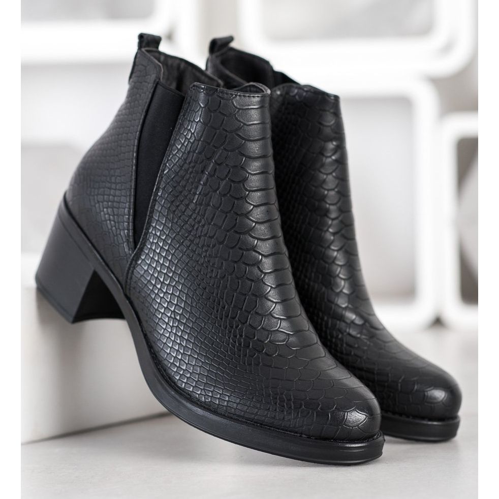 Discover the fashionable and elegant Sweet Shoes ankle boots in black, which will perfectly complement your autumn/winter wardrobe. These unique women's ankle boots are distinguished by a upper made of high-quality ecological leather, decorated with an embossed pattern resembling crocodile skin.
