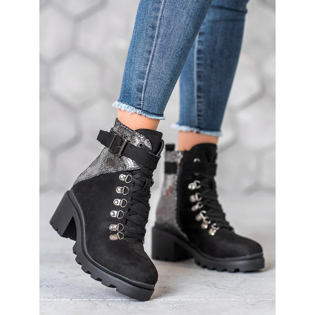 The boots are equipped with 2 cm platforms and a comfortable wide 6 cm heel, providing stability and comfort throughout the day. The lacing, zipper and decorative strap with a buckle are not only practical solutions, but also stylish details that distinguish these shoes from others.